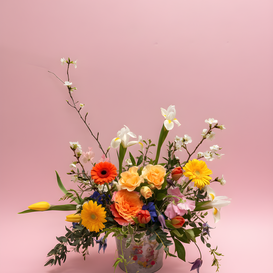 A playful and vibrant celebration of spring, Easter Whimsey brings together cheerful yellows, soft peach roses, and delicate seasonal blooms in a naturally flowing design. Accented with fresh greenery and light, airy branches, this arrangement feels bright, joyful, and full of life. Perfect for Easter gatherings, spring celebrations, or sending a fresh burst of color to someone special.